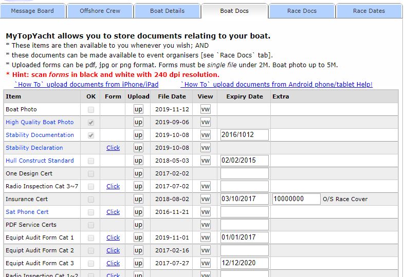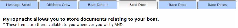 the organisers require the owners to submit for a particular event. They can then verify the compliance of the uploaded documents using the “OK” check box on the Race Docs page. Race Docs are stored in a separate folder for each event to isolate them from the routine Boat Docs and Race Docs for other events.