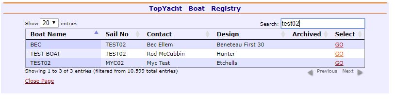 Below is the outcome after searching for the sail number TEST02. You can also search on owner name or design as well.